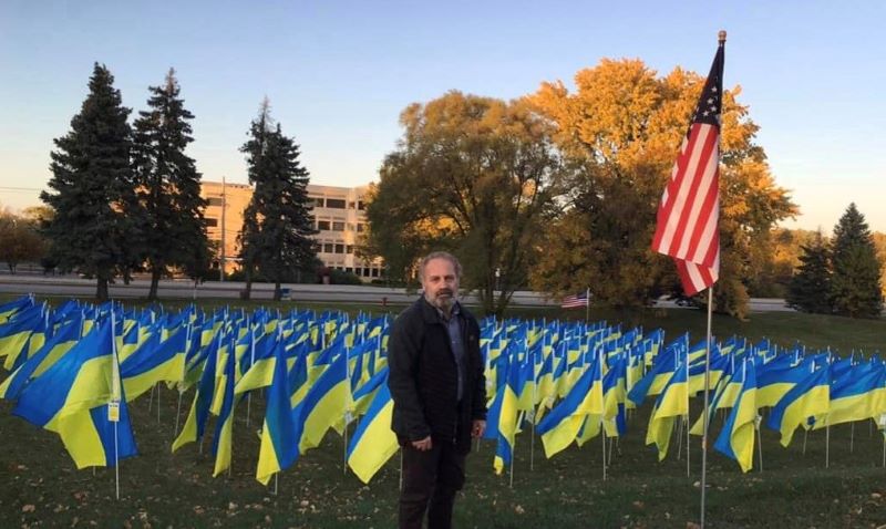 Në rrethinat e Chicago-s, në afërsi të shtëpisë në Roselle, para një kishe të madhe ukrainase me kryqin që vezullonte nën diellin e pasdites, pamë se lëndina aty ishte plot me flamujt të Ukrainës sikur të kishin mbirë nga toka e bekuar.