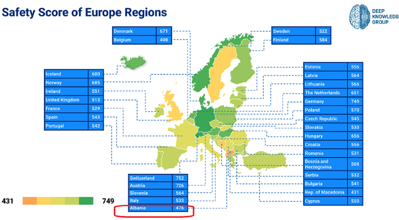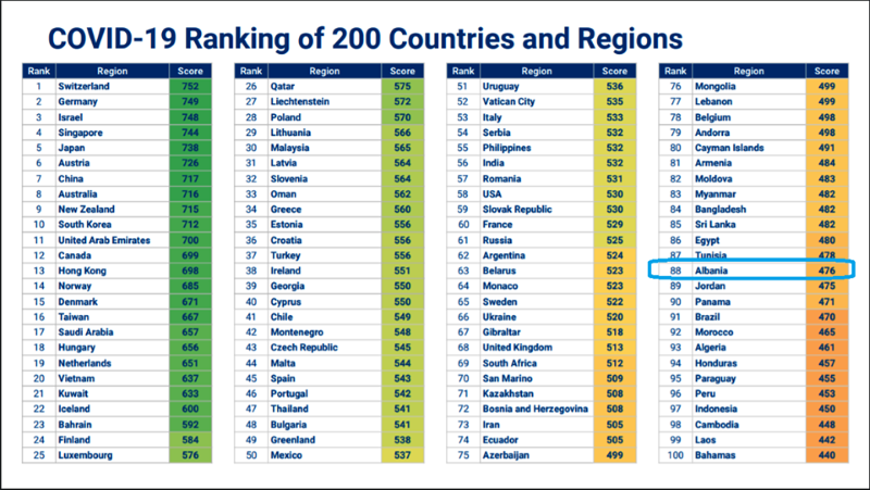 Ja për shembull, sot një prej institucioneve kërkimore prestigjioze, DKG “Deep Knowledge Group” pasi ka analizuar të dhënat e COVID-19 bazuar në informacionet e WHO, Worldometers, CDC, Johns Hopkins University, etj, e rendit Shqipërinë të parafundit (tabela e parë me 476 pikë) dhe një prej vendeve rajonale me nivel alarmant të sigurisë (tabela e dytë). Jemi në vendin e 88-të, ndërkohë që fqinjë tanë, si Greqia janë 54 vende më mirë se ne, Mali i Zi 46 vende më mirë se ne, apo vende rajonale si Bosnja që është 16 vende më mirë se ne, Serbia 34 vende më mirë se ne, etj.