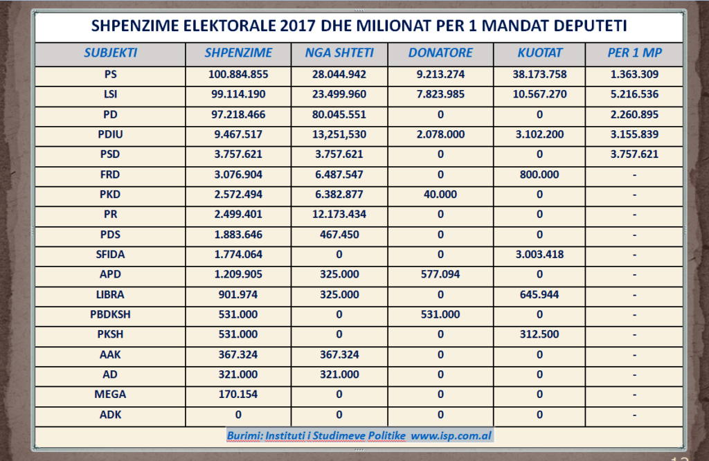 Gjatë 45 ditëve të vitit 2017 të dhënat e Institutit të Studimeve Politike (www.isp.com.al) marrë nga deklarimet e vetë partive (të cilat janë relativisht vetëm 30% e shifrave reale të shpenzimeve) dëshmojnë se Shqipëria harxhoi 3.262.815.150 lekë për të zgjedhur 140 deputetë, nga të cilët, 87% ishin zgjedhur sapo u shpallën listat, dhe fushata de facto bëhej për 13% të emrave në limitet e shanseve për fitore të listave proporcionale.