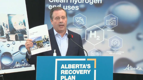 Prodhimi i hidrogjenit mund të jetë "një kapitull i ri në historinë e pasur të Albertës si një eksportues global i energjisë", ka deklaruar kryeministri i provincës Jason Kenney, teksa ka paraqitur të Premten (05.11.2021) "Udhërrëfyesin" mbi të ashtuquajturin hidrogjen "blu", që prodhohet nga gazi natyror dhe karboni. Sipas qeverisë albertane, tregu global i hidrogjenit pritet të arrijë në 2.5 trilionë dollarë deri në vitin 2050. Jason Kenney theksoi gjithashtu se “Alberta ka burimet natyrore, teknologjinë dhe ekspertizën për t'u bërë një eksportues kryesor i hidrogjenit të pastër për tregjet në mbarë botën”. Në dokumentin e lartpërmendur, qeveria propozon veçanërisht të lehtësojë aksesin në kapitale për projektet e prodhimit të hidrogjenit dhe të mbështesë partneritetet publike-private në këtë sektor. Dokumenti thekson, ndër të tjera, rëndësinë e minimizimit të rreziqeve për investitorët duke vendosur politika afatgjata. Kryeministri Kenney nuk përmendi ndonjë investim të ri në këtë fushë, por rikujtoi disa njoftime të fundit, si krijimi i një qendre kërkimore hidrogjeni, nisjen e programit nxitës të industrisë petrokimike dhe ngritjen e uzinës së hidrogjenit në Edmonton, projekt që kushton rreth 1,4 miliard dollarë.