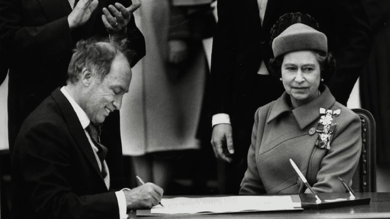 (Nënshkrimi i Deklaratën Kushtetuese më 17 Prill 1982 nga Elizabeth II dhe Pierre Elliott Trudeau)