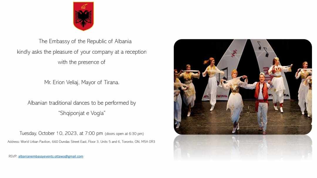 Kësaj radhe, lajmi për ardhjen e Veliajt u shpërnda përmes rrjeteve sociale, pas informacionit që qarkulloi rreth një ftese që ishte dërguar në mënyrë selektive për të njoftuar një pritje të organizuar nesër, 10 tetor 2023, nga Ambasada Shqiptare në Kanada dhe ku njoftohet prezenca e Kryetarit të Bashkisë së Tiranës.