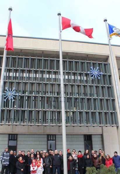 -Ngritja për herë të parë e Flamurit Shqiptar para bashkisë së Winnipeg.
