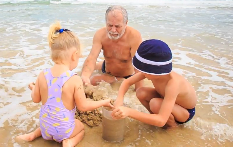 Gjyshi, në të 60-at, është shtrirë përbri nipit 4-5 vjeçar, në kufirin mes ujit dhe rërës. Sa herë vjen vala, nip e gjysh përplasin këmbët “me breshëri”, ngrenë stërkala dhe, kur këto u bien mbi trup e fytyrë, kukurisen me të madhe.