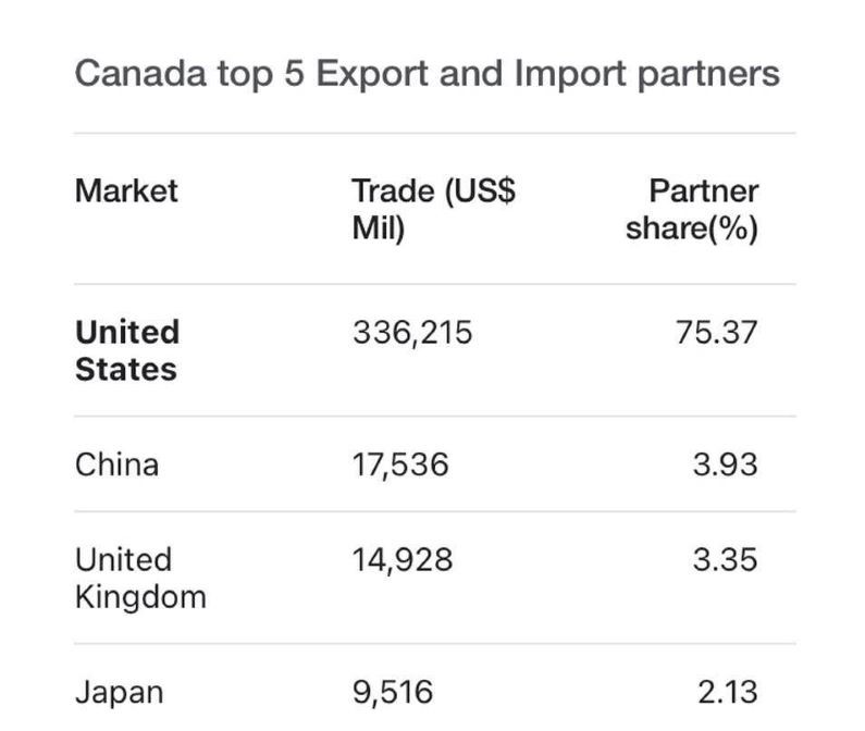 Ka një arsye edhe kjo. Sepse edhe Kanadaja është shumë e rëndësishme për Ameriken, në të gjitha fushat. Në këtë kuptim them se Kanadaja përfiton më shpejt se pjesa tjetër e Perëndimit në teknologji. Sipas statistikave të dhëna në tabelën më poshtë, shkëmbimet tregtare të Kanadase me Amerikën zënë 75% të shkëmbimeve, krahasuar me 5 partnerët e tjerë kryesorë të Kanadasë. Kjo është një shifër tepër e lartë.