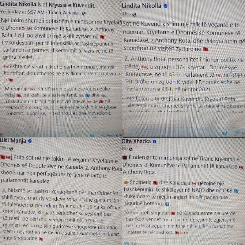 1) Lindita Nikolla, kryetare e Kuvendit: “Një takim shumë i dobishëm e miqësor me Kryetarin e Dhomës së Komuneve të Kanadasë, z. Anthony Rota, i cili po zhvillon një vizitë zyrtare në Shqipëri. Dakordësuam për të intensifikuar bashkëpunimin parlamentar përmes shkëmbimit të vizitave në të gjitha nivelet. Kanadaja është një vend mik dhe partner i çmuar, me një kontribut domethënës në zhvillimin e demokratizimin e Shqipërisë…”