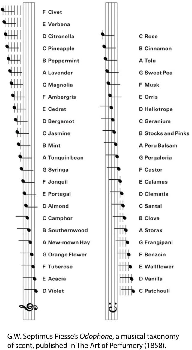 Së bashku me manualin e plotë mbi parfumet dhe esencat, Septimus Piesse, gjithashtu, krijoi, një instrument, i cili i kompozonte esencat dhe aromat përmes notave muzikore, me qëllim klasifikimin e parfumeve, bazuar në kombinimet olfatike, sikurse, notat harmonizohen për të krijuar një simfoni të papërsëritshme. Instrumenti u quajt “odophone” dhe ndihmoi të kuptohej dhe formulohej një aromë përmes notave të parfumuara.
