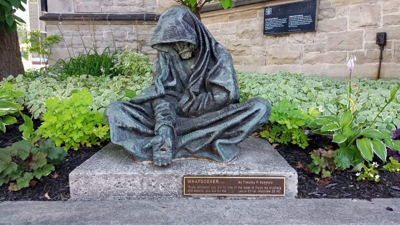 Foto: Statuja e Jezusit si lypës në Ottawa ka për autor skulptorin kanadez Timothy Shmalz dhe është e vendosur në kryqëzimin e rrugëve Kent dhe Wellington.