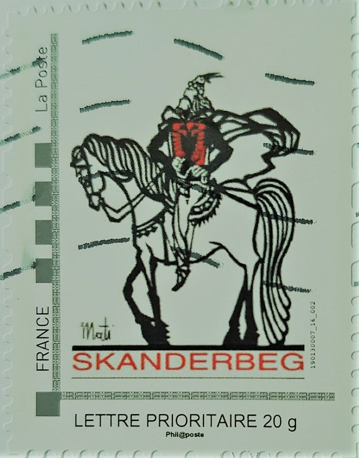 Janë thjesht dy pulla, punuar me art, elegancë: kalorësi legjendar dhe kështjella e pamposhtur e shtetit të tij të pavarur, dy pulla që sot n’a japin kënaqësinë t’i vendosim në letrat që dërgojmë në çdo cep të botës. Ja pse ky heroi i Mesjetës vazhdon shtegtimin e tij në hartën e botës, përmes letrave intime të njerëzve.