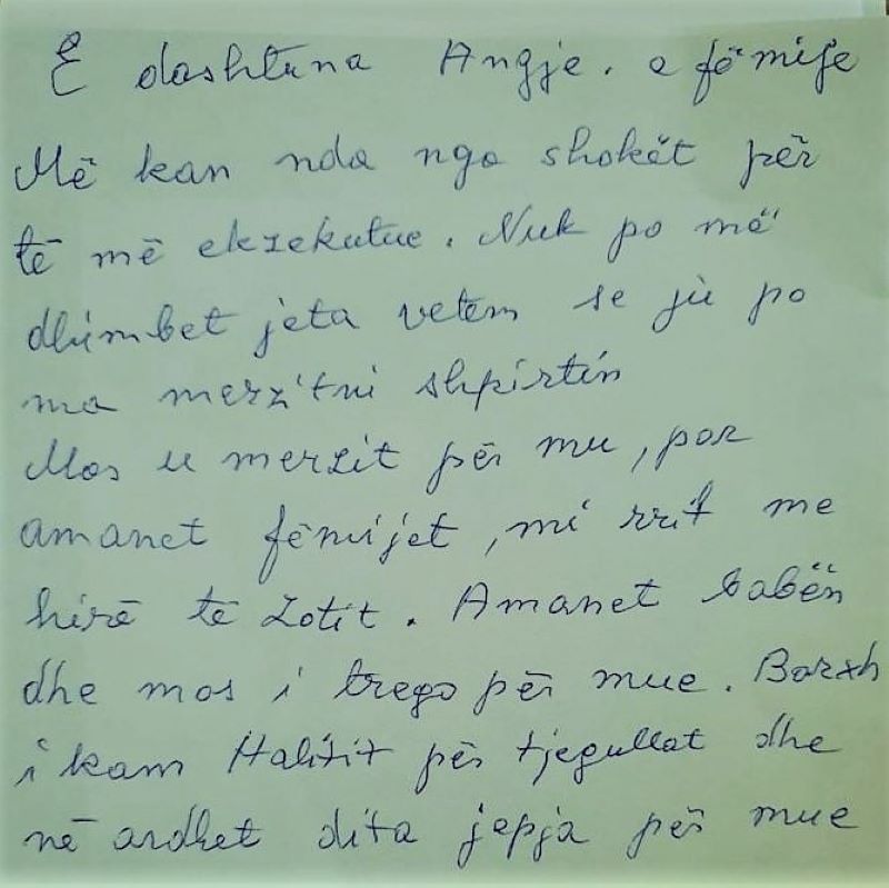 Lexoja një letër që Mark Shllaku, një mësues 31 vjeçar, i dërgon gruas e fëmijëve të tij, vetëm pak kohë para se të pushkatohej.