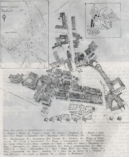 Shënim: Skica lart e pazarit me shënimet përkatëse, është nxjerrë nga libri i profesor Piro Thomo “Korça, urbanistika dhe arkitektura”.