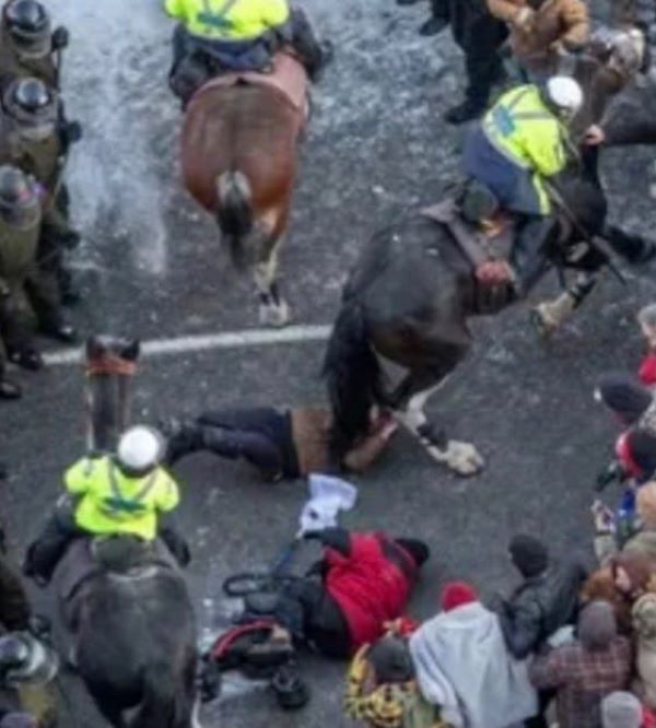 Janë përdorur edhe kuaj për ta ndarë turmën e protestuesve në mes dhe në një foto duken dy persona të shtrirë në tokë mbi të cilët kanë shkelur kuajt. Policia ka mohuar se ka të plagosur ndërsa nga manifestuesit thuhet e kundërta, të paktën për personat që shihen në foton e mëposhtme (nga asnjë media nuk ka konfirmim për këtë). Në filmime policët janë dëgjuar të avanconin përpara duke thirrur në kor, pamje këto që të kujtonin filma me beteja në kohët e lashta. Përballë tyre, dëgjoheshin zëra manifestuesish që kendonin himnin kombëtar “O Canada”.