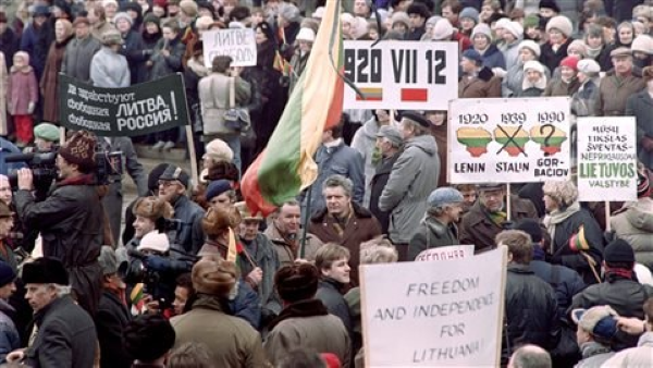 Manifestim në Vilnius, 10 janar 1990, në mbështetje të pavarësisë së Lituanisë. Mbi pankarta lexohet: “Lituania e lire garantohet nga Perestroika” - Credit Vitaly Armand/AFP/Getty Images