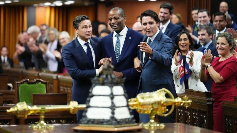 Greg Fergus, i cili i zotëron të dy gjuhët zyrtare, u shoqërua simbolikisht drejt fronit të kryetarit nga kryeministri Justin Trudeau dhe kreu i opozitës zyrtare Pierre Poilievre. Rituali është pjesë e traditës parlamentare që synon të nderojë kryetarët, të cilët në të kaluarën rrezikuan ekzekutimin për të përmbushur detyrat e tyre. Fergus, ndër të tjera, ka ushtruar postet e Sekretarit Parlamentar të Kryeministrit dhe Kryetarit të Bordit të Thesarit. Këtë vit, ai gjithashtu u qortua zyrtarisht nga Komisioneri i Etikës sepse i shkroi një letër mbështetje CRTC (Canadian Radio-Television and Telecommunications Commission) për një kanal televiziv frëngjishtfolës, Natyf inc., i cili kërkonte leje transmetimi në të gjithë provincën Québec.