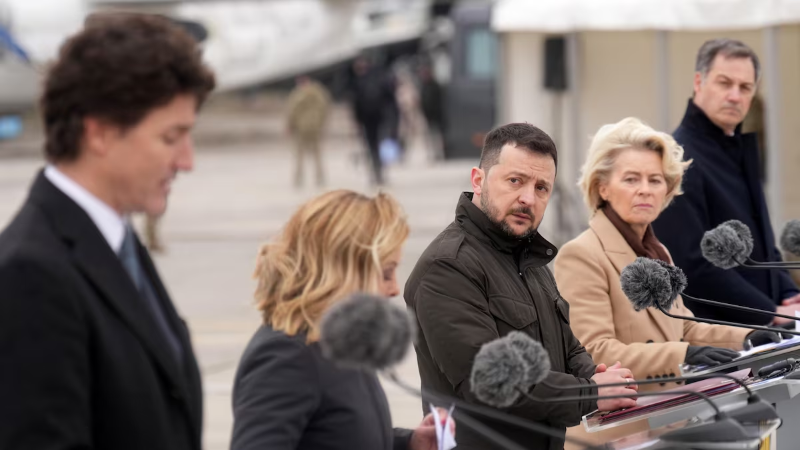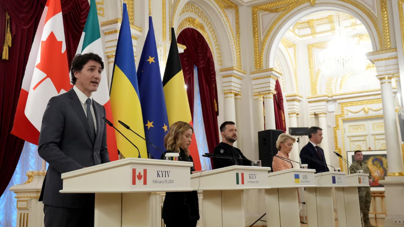 Në dy vjetorin e nisjes së sulmit ushtarak të Rusisë ndaj Ukrainës, kryeministri kanadez Justin Trudeau ka vizituar Kievin sot paradite (24.02.) për të manifestuar sërish mbështetjen e Kanadasë ndaj popullit ukrainas. Njëkohësisht me të, sot në kryeqytetin e Ukrainës ndodheshin edhe tre aleatë evropianë, kryeministrja italiane, Giorgia Meloni, kryeministri belg, Alexander de Croo dhe presidentja e Bashkimit Evropian, Ursula Von Der Leyen.