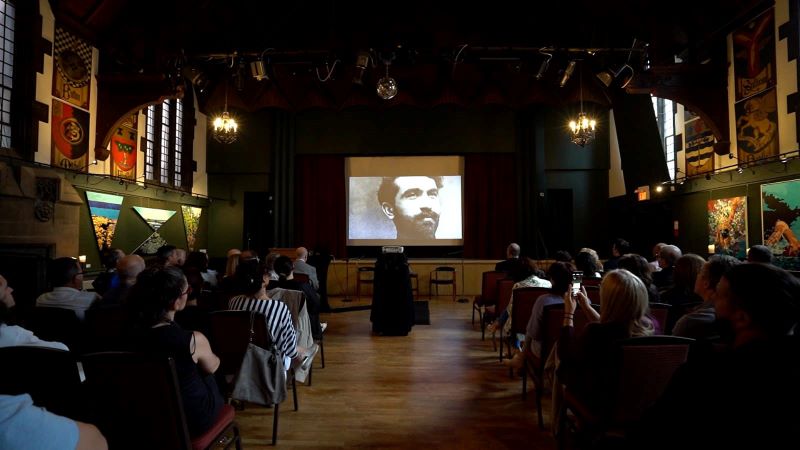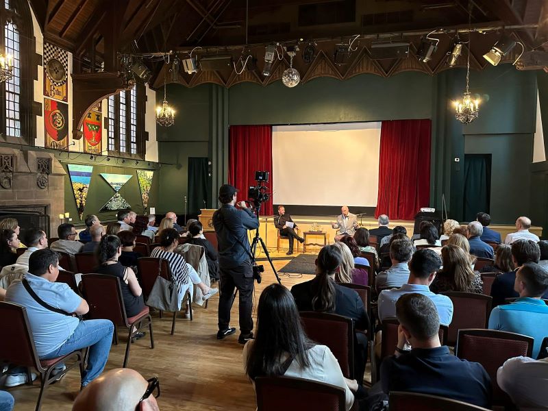 U mblodhëm në një nga ato sallat klasike, tip katedrale në qendër të Torontos, ku e vjetra qëndron hijshëm krahas modernes. Ndjeva përnjëherësh se atmosfera i shkonte si jo më mirë "Apostullit".