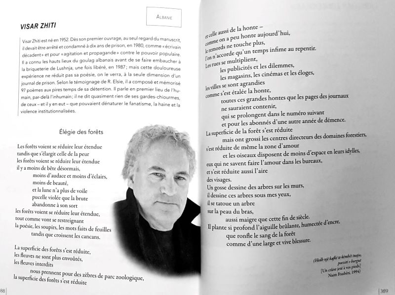 Përfshirja në një antologji të Poezisë Botërore prej rreth 750 faqesh, me poetë të zgjedhur nga vende të ndryshme të botës, është padyshim një kënaqësi, pa nevojën e duartrokitjes, ndërkohë që Shqipëria ka poetë të mrekullueshëm që do duhej të ishin pjesë, por kjo përzgjedhje është bërë nga francezët dhe nga një shtëpi botuese me emër «Editions Caractères». Çdo poet është përfaqësuar me një poezi siç është përfaqësuar Visar Zhiti me poezinë «Elegji e pyjeve», Entela Kasi me poezinë «Nëse bota është e egër, Anja» dhe unë me poezinë «Elegji për kukullat e Detit Egjé», apo nga Kosova, Agim Gjakova, me poezinë «Gruas sime».