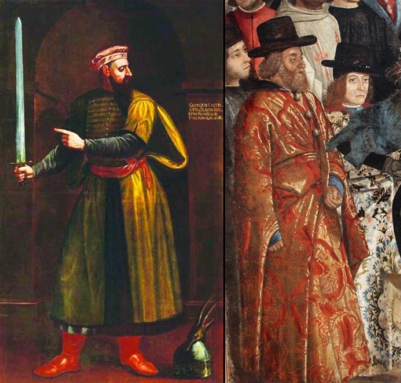 Veças tyre ekziston një portret i Skënderbeut realizuar më 1463, i cili përkon me kohën kur ai ka qëndruar në Romë. Si i tillë ai mund të konsiderohet autentik dhe shërben si pikë referimi rreth pamjes së heroit. Në grafikën te Barleti, ai paraqitet me petkun e një rangu të lartë, ashtu siç e përshkruan dhe historiani roman apo siç shihet në pikturën e Cristofano dell’Altissimo-s vite më vonë. Veshja e tij është ajo e një fisniku të kohës, me kësulë, mantel të rëndë prej pëlhure me dekoracione floreale dhe gëzof. Manteli në ngjyrë të kuqe i pasqyruar në pikturë, që aludohet të ishte veshja tipike e Gjergj Kastriotit, është tregues i përkatësisë së rangut më të lartë. Këtë kostum Skënderbeut ia dhuronte çdo vit Senati i Venedikut, sipas letërkëmbimeve me ambasadorin e tij në Venedik, Gjergj Pellinin. Ndër të tjera, ai e porosiste të merrte dhe dy veshjet me stofin ngjyrë skarlet, që i dërgonte Serenissima. Në portretin e Firences, Kastrioti mban një beretë prej tekstili të ngjeshur ngjyrë skarlet, stil italian i periudhës së Mesjetës që përfundon me një fortesë që mbështillet si kurorë përqark rrethit të kokës, nën të cilën duket pjesërisht dhe nënkresa e bardhë ose me ornamente. Ky model në formë cilindrike përdorej nga fisnikët e rangut të lartë ose gjeneralët ushtarakë dhe cilësohet sipas botimit të parë mbi veshjet dhe kostumet “la beretta ducale”. Nga vëzhgimet në disa skica, gravura e piktura që datojnë në shekullin XVI, rezulton se Skënderbeu, krahas beretës, paraqitet me një kësulë konike të thjeshtë me bordurë gëzofi ngjashëm me plisin, si dhe një lloj kapuçi të hershëm me majën lart të përthyer i quajtur kapuçi frigjian me të njëjtën fortesë gëzofi. Nuk mund të konfirmohet nëse kanë bërë pjesë në repertorin e veshjeve të zgjedhura për heroin, por ato janë modele, të cilat janë përdorur gjerësisht deri në fillim të shekullit XIX në popullsitë arbëreshe në Greqi dhe Italinë jugore, si dhe në territorin shqiptar.