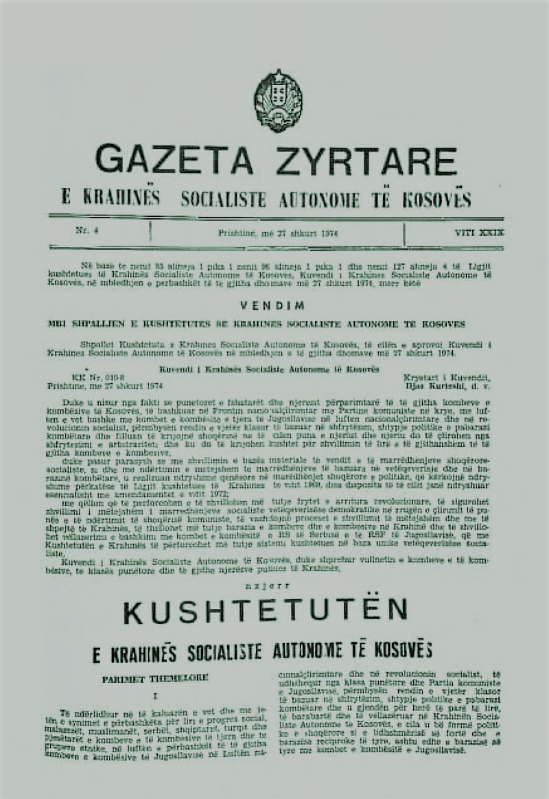 Në historikun e shtetndërtimit të Kosovës, kushtetuta që Kuvendi i KSA të Kosovës miratoi më 28 Shkurt 1974, shënon gurëthemelin e saj institucional. Me këtë dokument politik-juridik, Kosova barazohej me njësitë e tjera të Federatës Jugosllave, ndonëse ruante gjendjen duale në raport me Serbinë (në kuadër të saj), por si subjekt konstituiv i federalizmit jugosllav. Kjo pasqyrohej në nenin 1 të Kushtetutës federative në paragrafin e parë kur ajo radhitej bashkë me gjashtë republikat e tjera, ndërsa paragrafi i dytë theksonte (përbërjen) në kuadër të RS të Serbisë.
