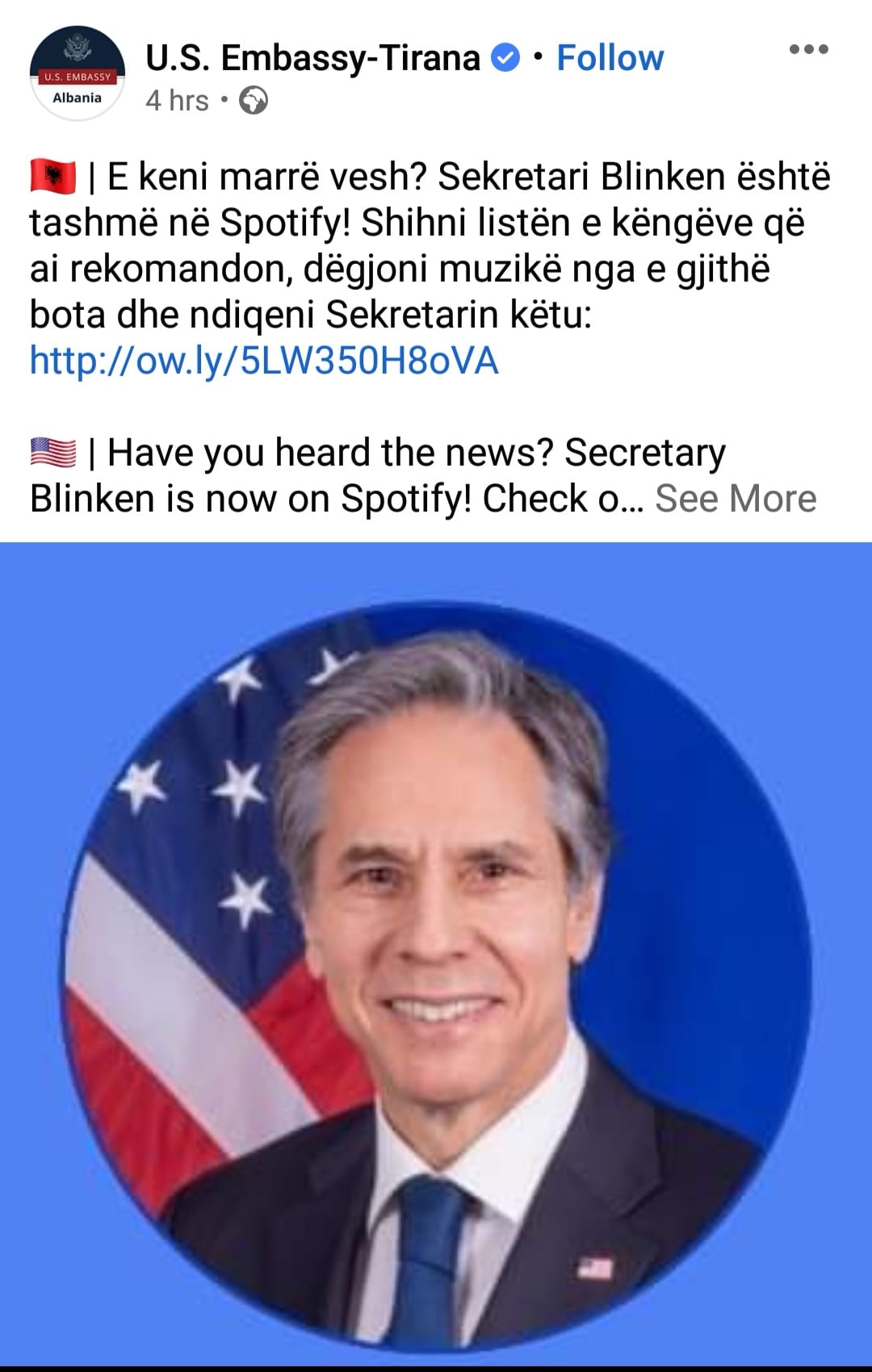 Na vjen keq t’a zhgënjejmë ambasadën, por në çdo rast shqiptarët nuk janë hiç të çuditur që Zoti Blinken e ka qejf muzikën… sepse “kënga” e Zotit Bliken dhe e politikës qe ai përfaqëson, ka kohë që u serviret atyre si pjesë e një ahengu banal në të cilin i kanë detyruar të hedhin dhe një valle shumë të shëmtuar.