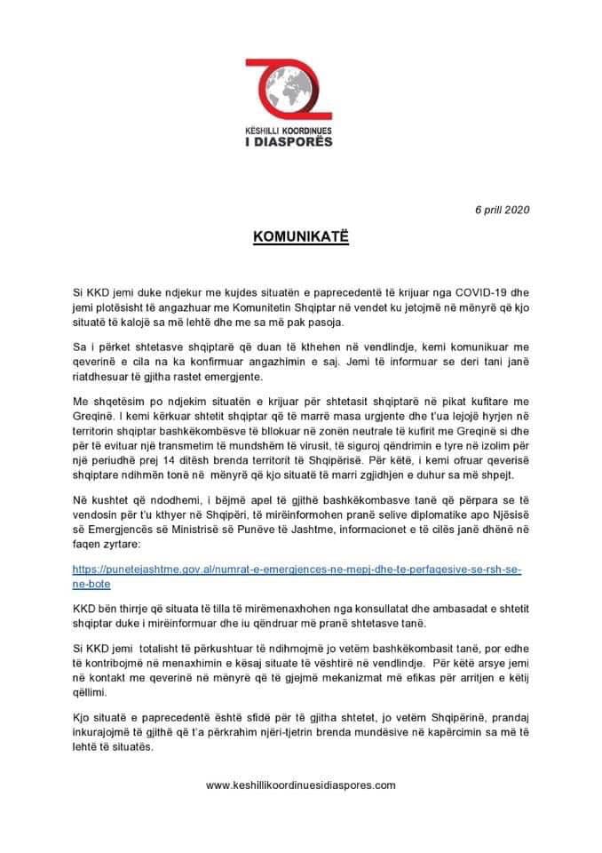 Pas editorialit të djeshëm të FlasShqip me titull “Shpallet në kërkim KKD dhe ministri Majko” ku kritikohej apatia e Këshillit Koordinues të Diasporës ndaj gjendjes së bashkëatdhetarëve tanë në kufirin greko-shqiptar dhe mungesa e ndonjë propozimi nga ana e tyre për zgjidhjen e situatës, sot vumë re përmes rrjeteve sociale që KKD ishte shëndoshë e mirë. Në Facebook qarkullonte një “komunikatë” e KKD të cilën e gjeni më poshtë dhe që ne e siguruam në rrugë jozyrtare.
